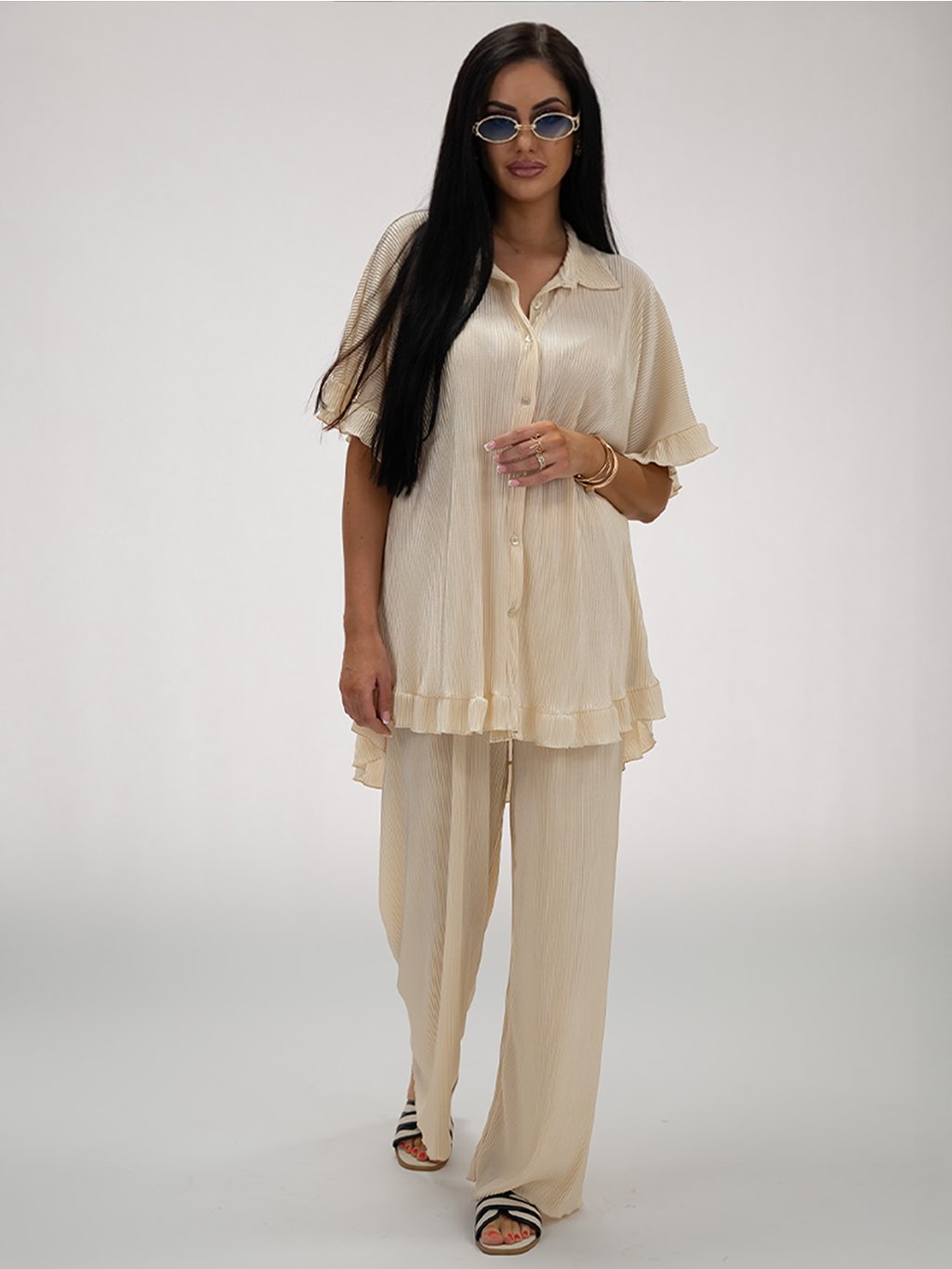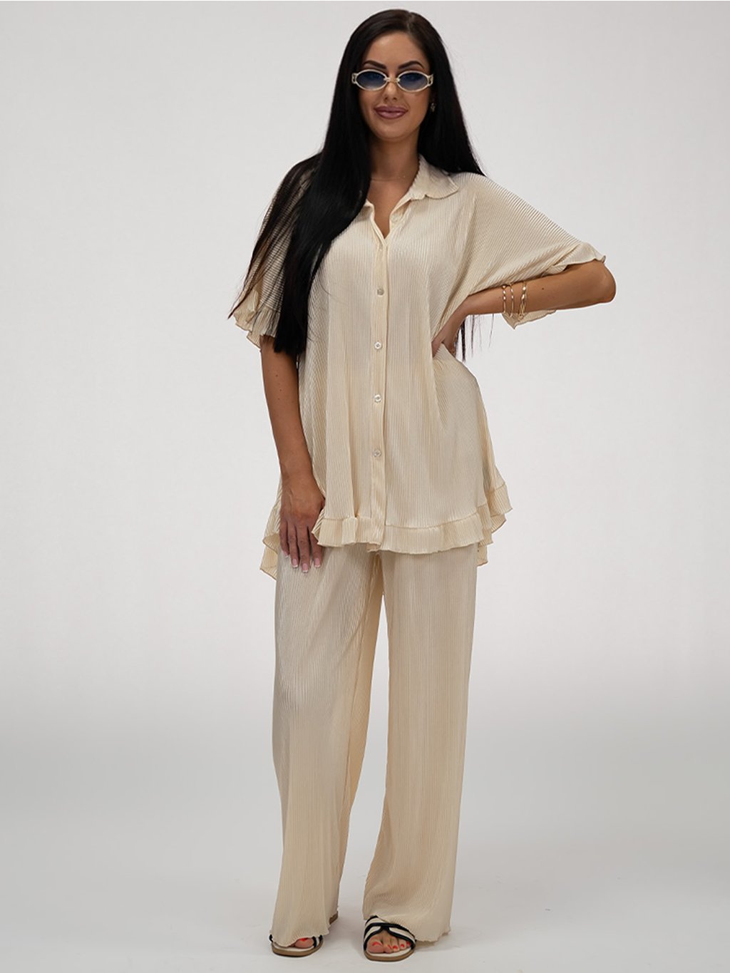 Obsahuje voľnú košeľu s krátkymi rukávmi a jemným gombíkovým zapínaním, ktorú dopĺňajú široké dlhé nohavice. Vrúbkovaný materiál dodáva celkovému vzhľadu moderný a sofistikovaný nádych. Riasený spodný lem košele pridáva na ženskosti a jemnosti. Perfektná voľba na letné dni, dovolenkové chvíle alebo ležérne elegantné outfity na bežné nosenie.