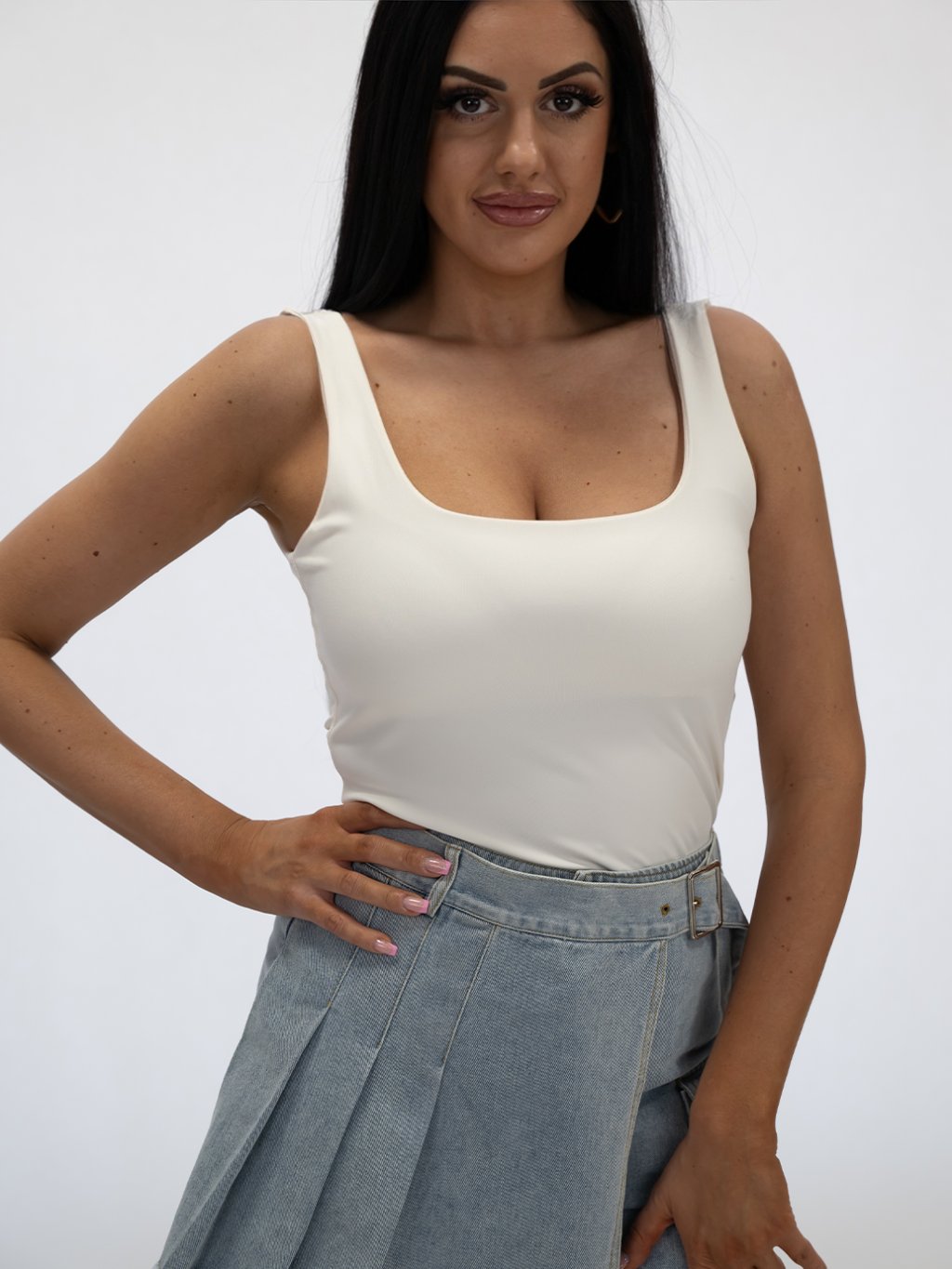 Jeho priliehavý strih krásne zvýrazní postavu a vďaka jemnému materiálu je mimoriadne pohodlný na nosenie. Hladký dizajn bez zbytočných detailov umožňuje ľahké kombinovanie s rôznymi outfitmi – či už s džínsami pre ležérny vzhľad, elegantnou sukňou na večerné príležitosti alebo šortkami počas horúcich letných dní. Top má širšie ramienka, ktoré poskytujú dostatočnú oporu a výstrih v tvare U, ktorý lichotí dekoltu. Je ideálny na vrstvenie pod sako alebo kardigan, ale rovnako dobre vynikne aj ako samostatný kúsok.