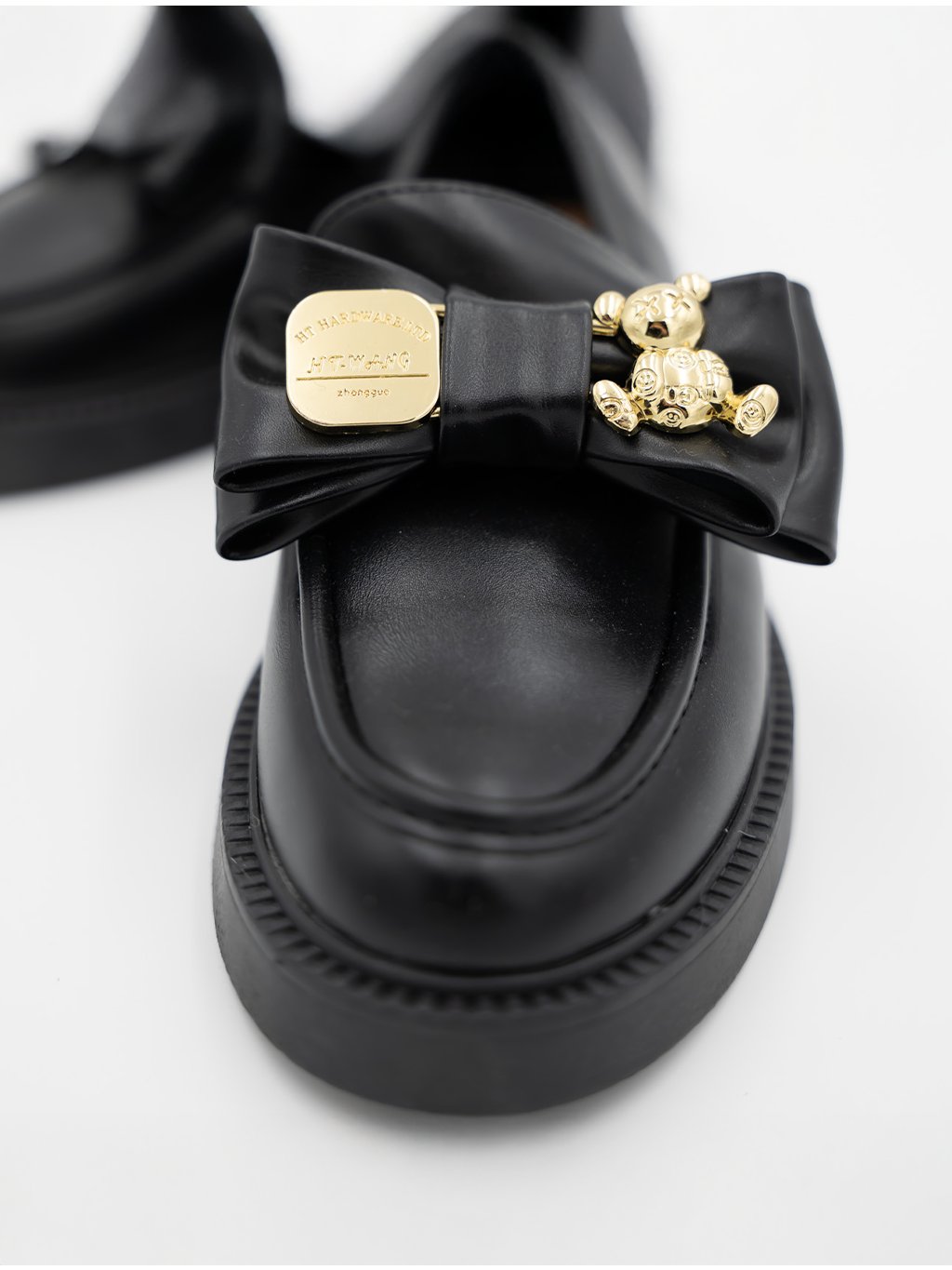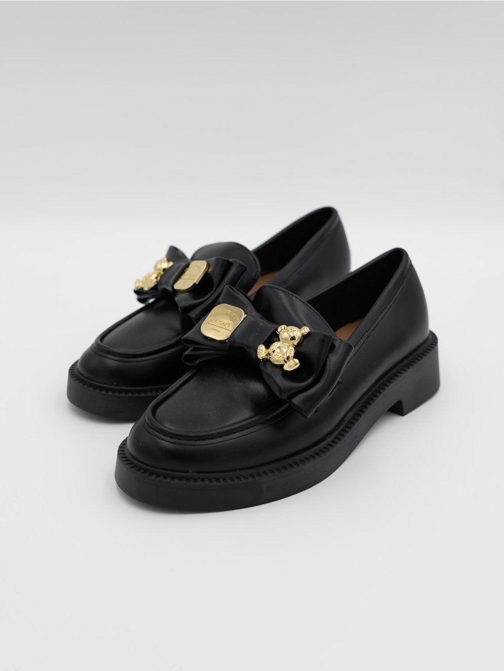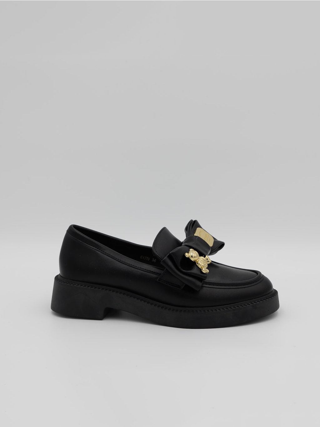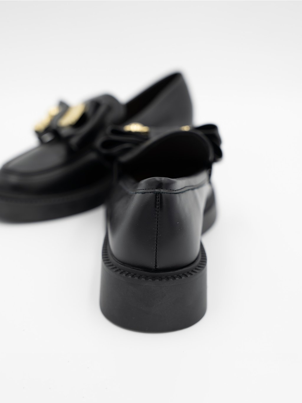Doplňte svoj šatník o tieto štýlové čierne mokasíny s výraznou ozdobnou mašľou a zlatými detailmi.