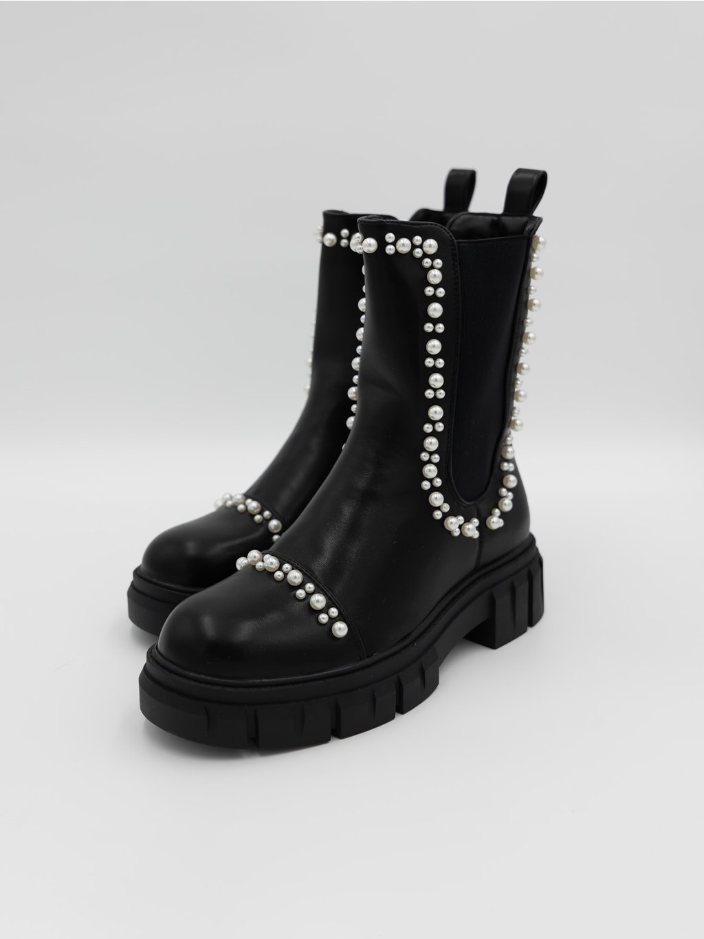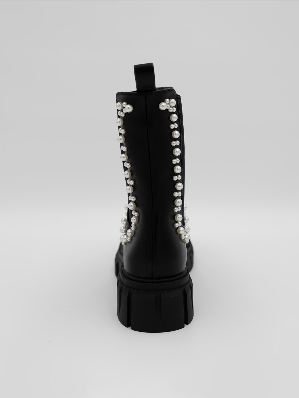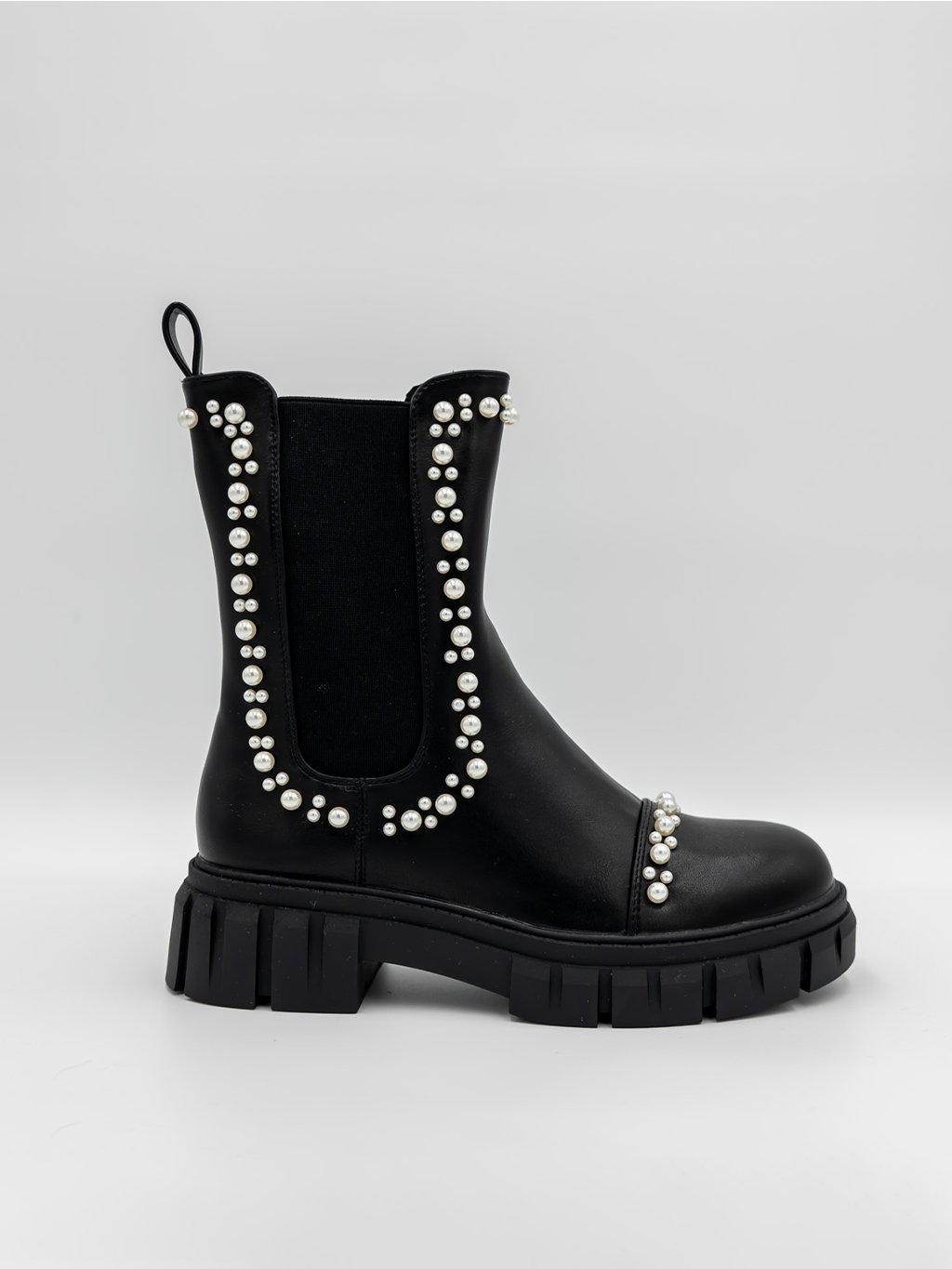 Čierny povrch je doplnený o elegantné perlové zdobenie, ktoré im dodáva jedinečný šmrnc. Robustná podrážka zaisťuje pohodlie a stabilitu pri nosení.