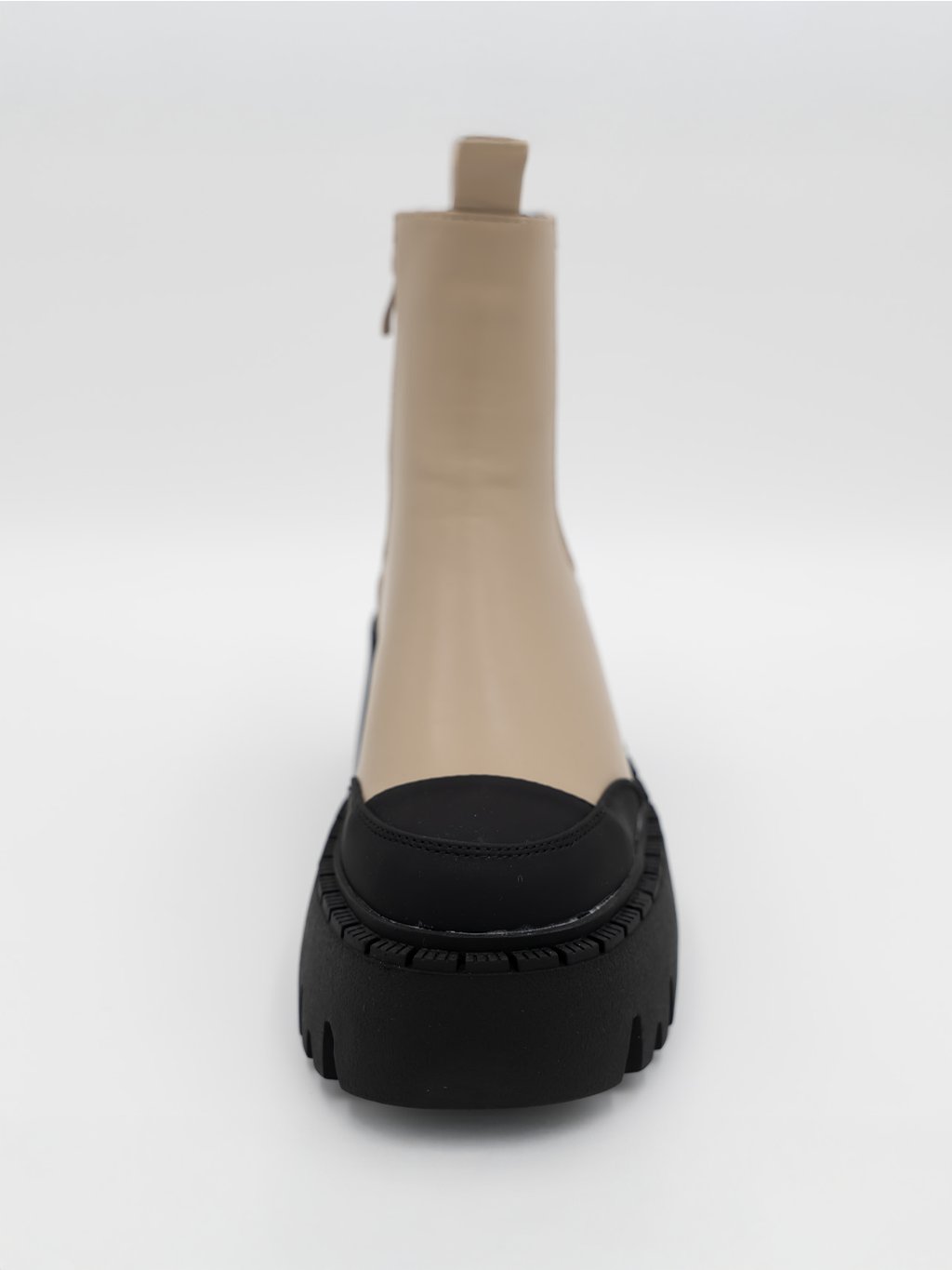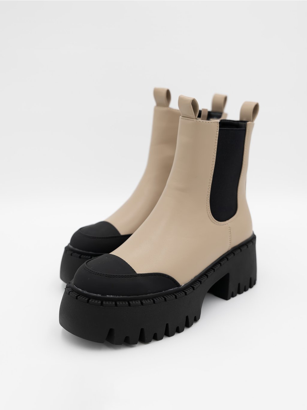 Štýlové dámske členkové čižmy workery v neutrálnej béžovej farbe doplnenej čiernymi detailmi a masívnou podrážkou, ktoré zaručujú pohodlie aj v chladnejšom počasí.