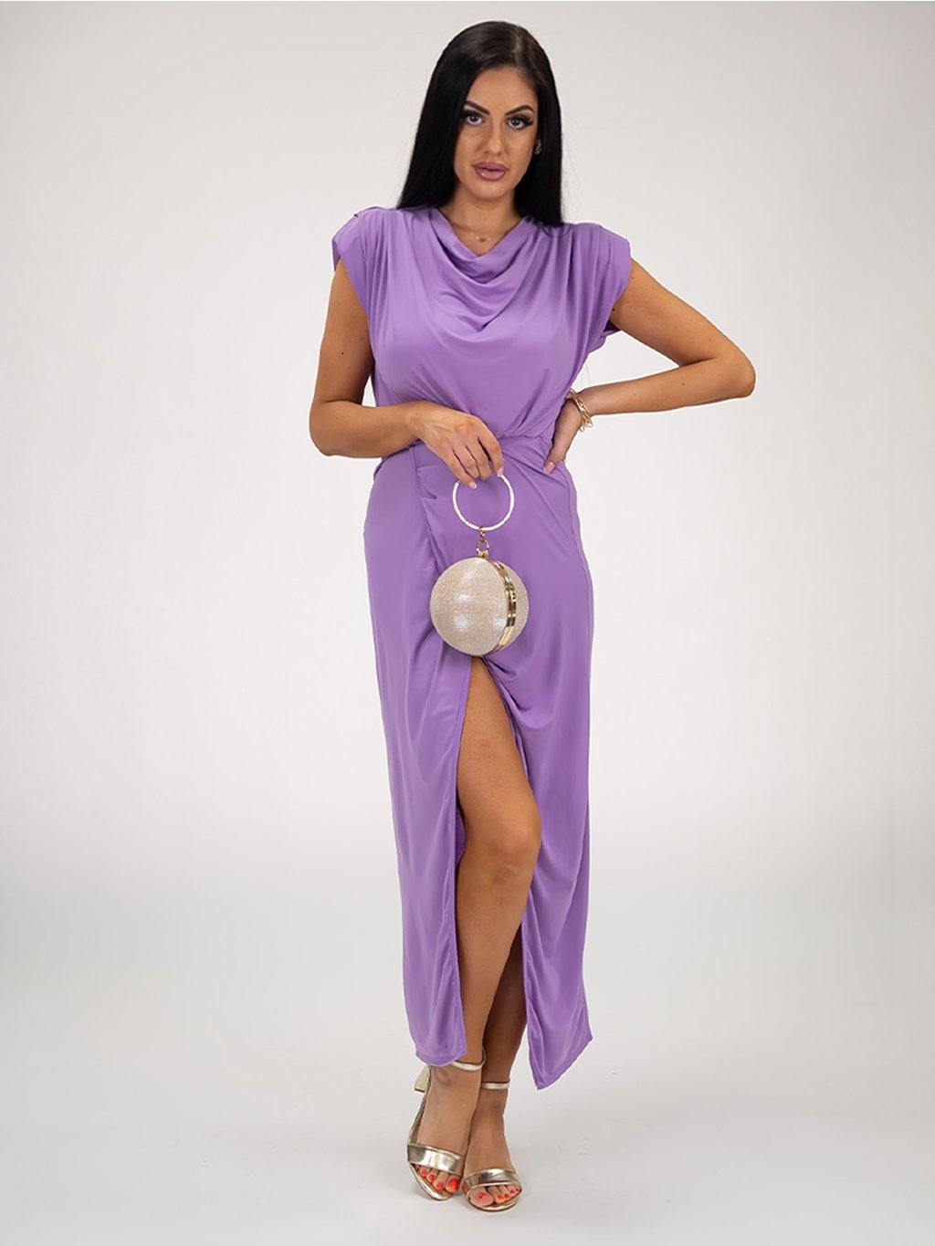 ch jemne padavý výstrih s riasením dodáva šatám sofistikovaný vzhľad, zatiaľ čo asymetrický strih s rozparkom na nohe pôsobí zvodne a elegantne. Pás je jemne naznačený riasením, čo krásne zvýrazní ženské krivky. Šaty sú vyrobené z ľahkého, príjemného materiálu, ktorý sa krásne prispôsobí postave a poskytne pohodlie počas celého dňa alebo večera. Ideálne na večerné eventy, oslavy či iné spoločenské udalosti.