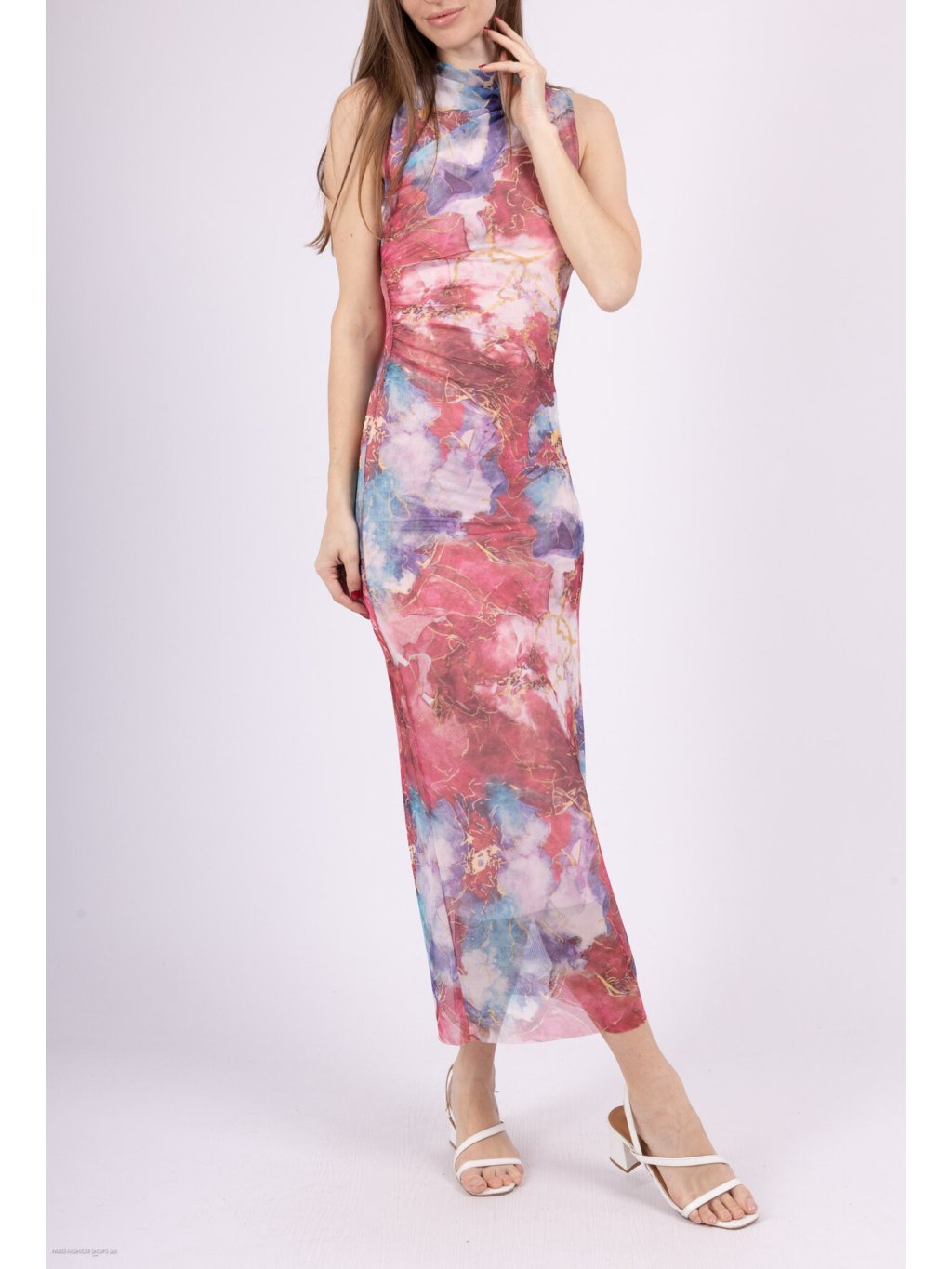 Jemný materiál sa krásne prispôsobí postave a vytvára elegantnú siluetu. Vysoký golier a bezrukávový strih pôsobia moderne a sofistikovane. Výrazná kombinácia ružových, modrých a zlatistých tónov vytvára jedinečný mramorový efekt, ktorý zaručene pritiahne pohľady. Skombinuj ich s minimalistickými sandálkami a jednoduchými doplnkami pre harmonický a módny vzhľad.