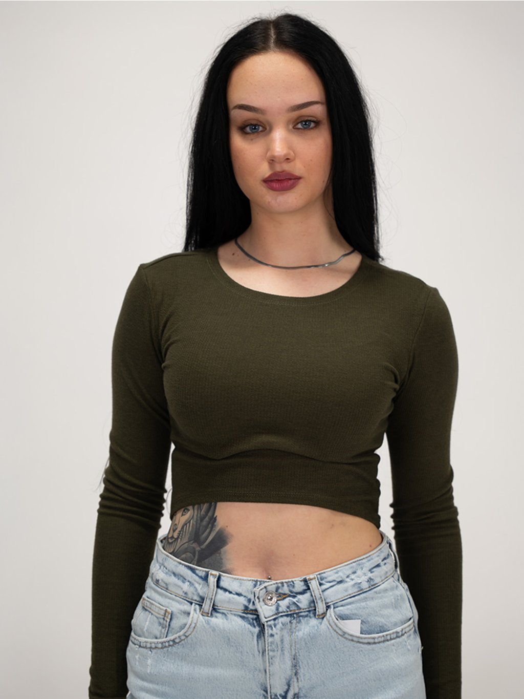 Khaki crop top s dlhým rukávom