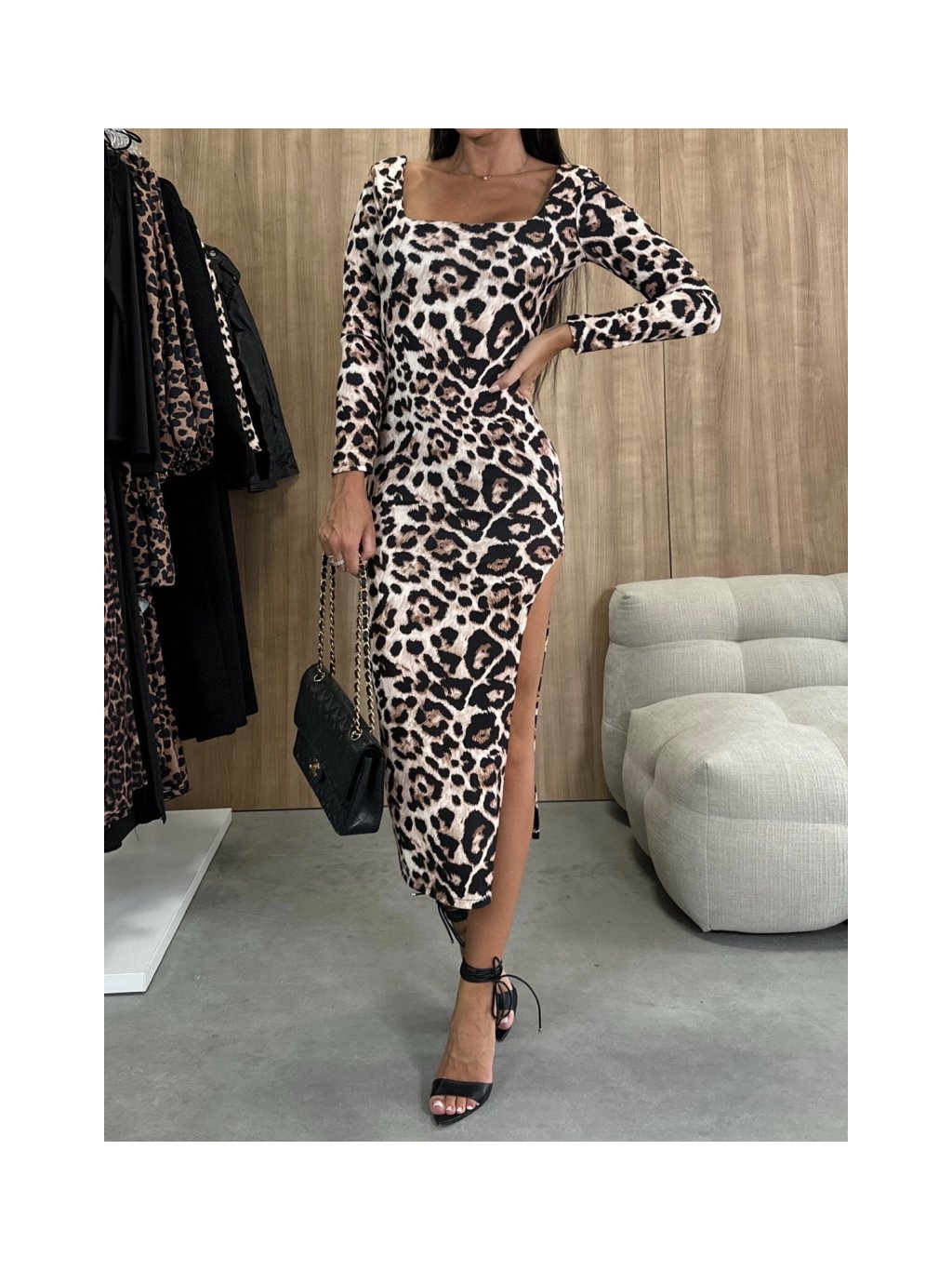 Sú vyrobené z elastického materiálu, ktorý zvýrazňuje postavu. Majú dlhé rukávy, dĺžku po lýtka a dramatický rozparok na jednej strane, ktorý pridáva na atraktívnosti. Zadná časť šiat je ozdobená prepracovaným šnurovaním, ktoré poskytuje jedinečný detail a umožňuje prispôsobenie šiat postave. Tento model je perfektný na večerné udalosti alebo špeciálne príležitosti, kde chcete zaujať.