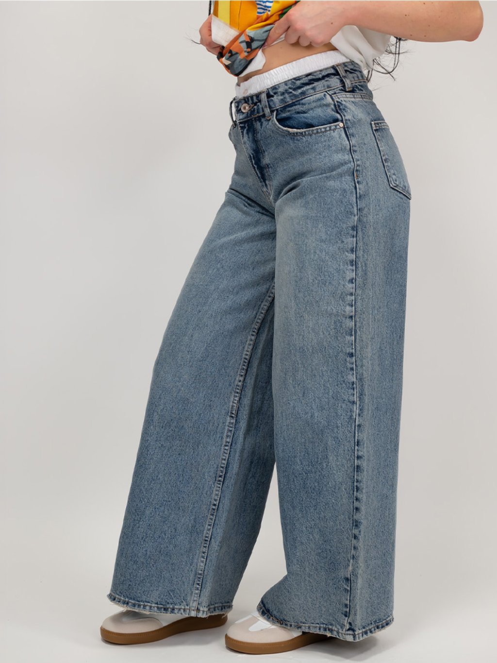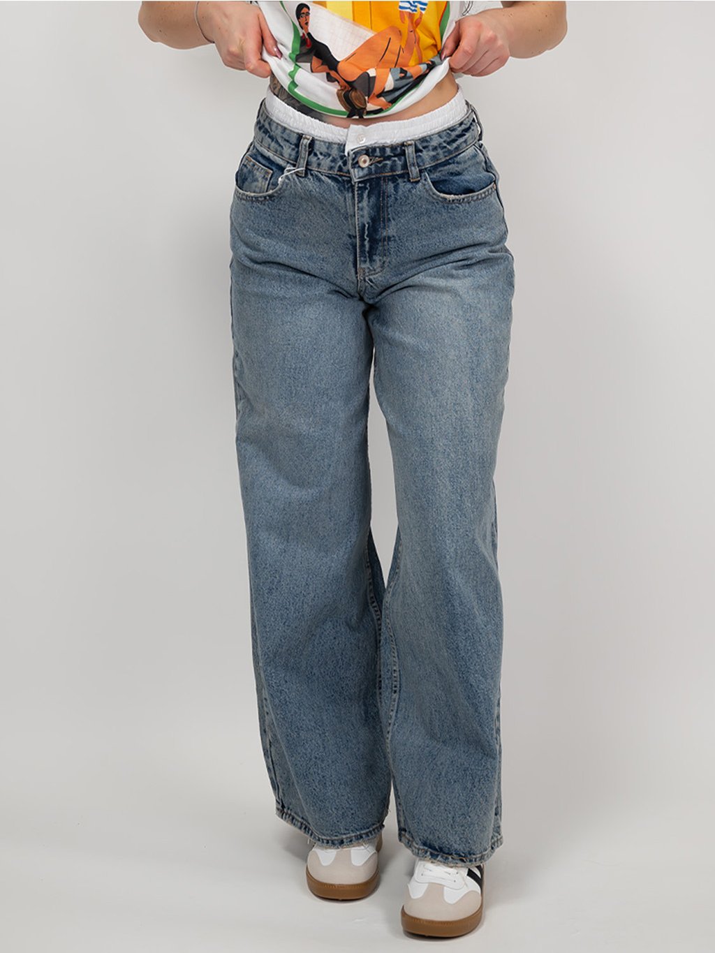 Originálne modré rifle so štýlovým detailom bieleho pásu, ktoré dodávajú klasickému kúsku moderný vzhľad.