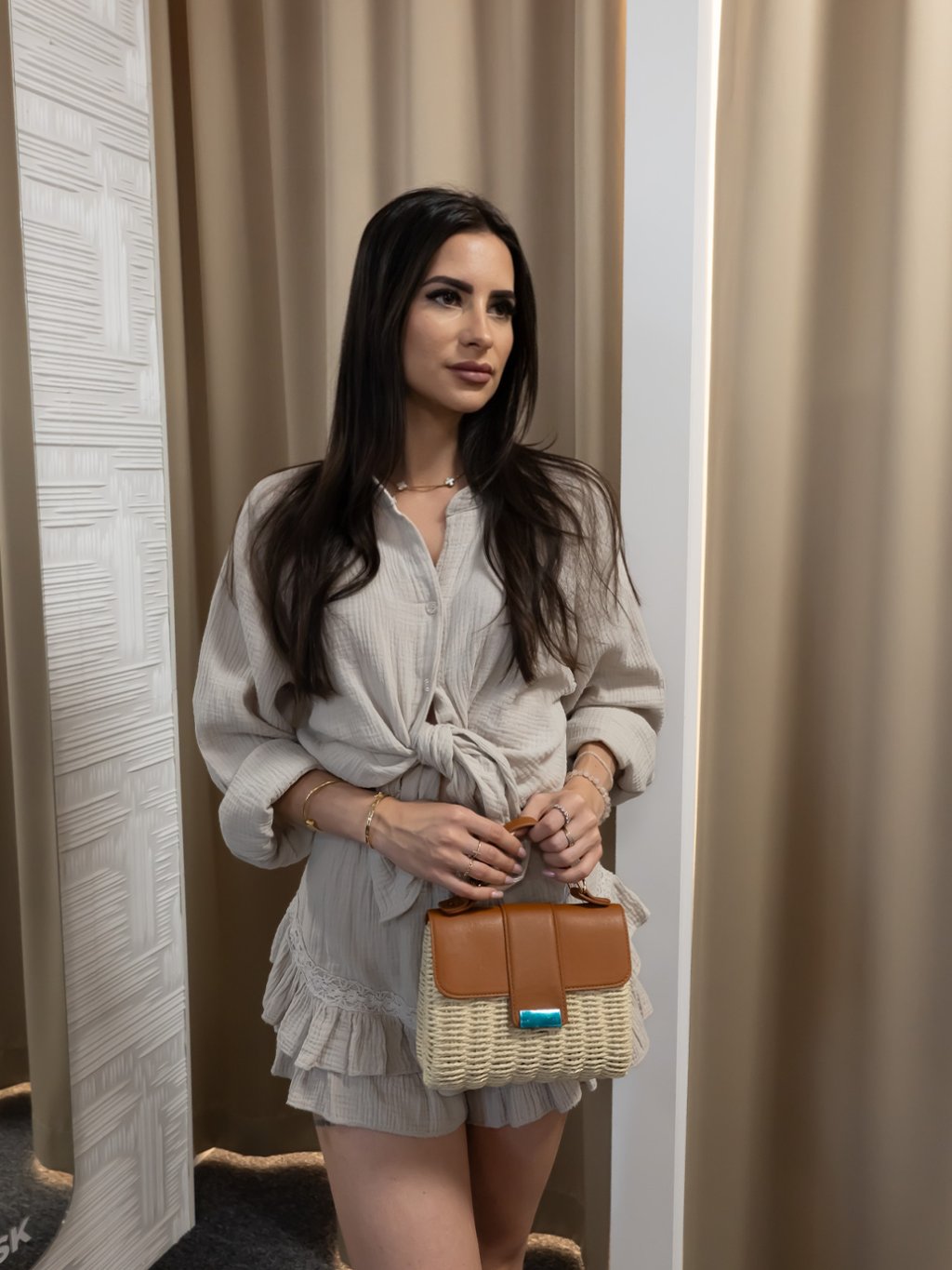 Komplet pozostáva z voľnej košele s dlhým rukávom, jemne predĺženým zadným dielom a zapínaním na gombíky. Druhou časťou sú krátke šortky s elastickým pásom, zdobené dvojitým volánom a jemnou čipkou. Mušelínový materiál je známy svojou mäkkosťou, priedušnosťou a prirodzenou štruktúrou, vďaka čomu poskytuje maximálne pohodlie aj počas horúcich dní. Béžový odtieň je univerzálny, ľahko kombinovateľný a pôsobí elegantne aj v casual outfite.