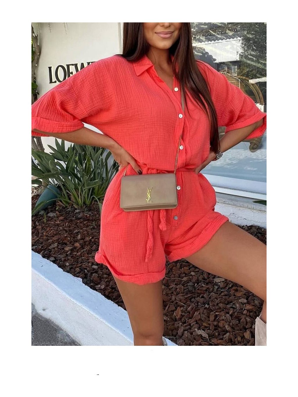Voľný strih s opaskom v páse zvýrazňuje postavu a poskytuje pohodlie počas horúcich letných dní. Overál má krátke rukávy s možnosťou ohrnutia a praktické gombíkové zapínanie vpredu. Ideálny na dovolenkové prechádzky, letné festivaly alebo bežné dni v meste. Stačí doplniť sandálmi a kabelkou a máte dokonalý letný outfit!