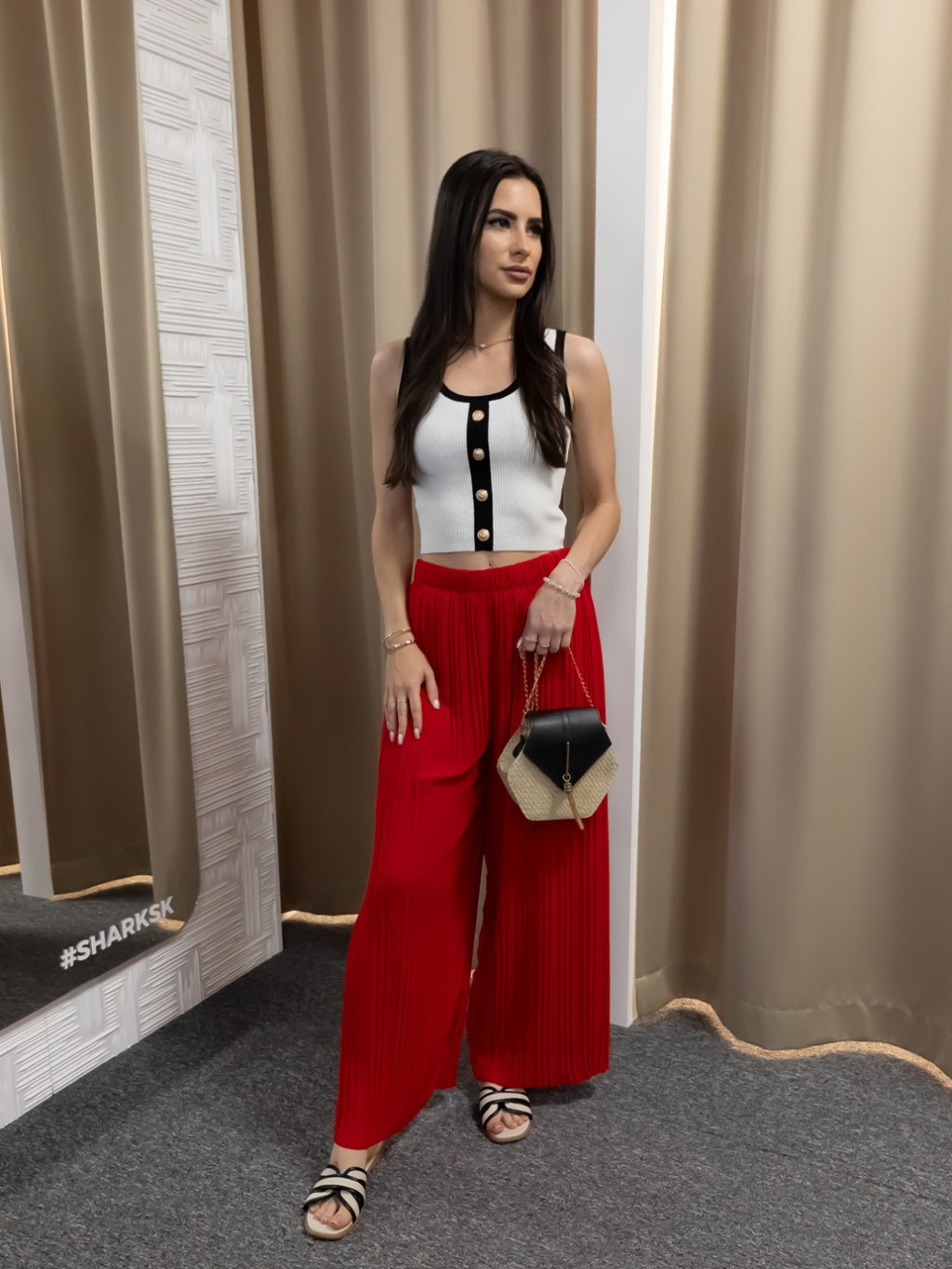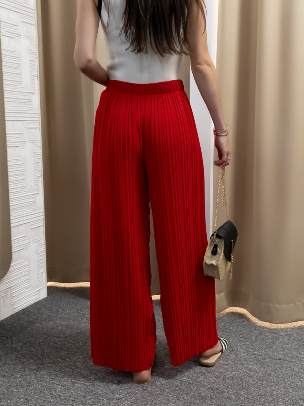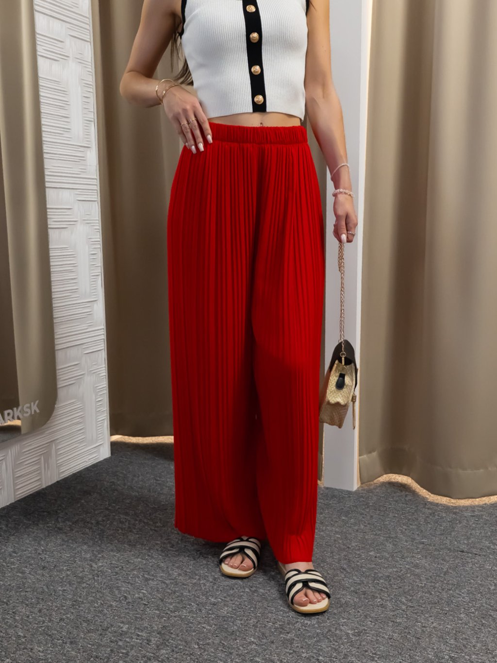 Vyrobené z ľahkej, splývavej tkaniny s jemnou viskózovou podšívkou, ktorá poskytuje komfort a nepriehľadnosť. Elastický pás zabezpečuje maximálne pohodlie a prispôsobenie sa postave. Široký strih a vertikálne plisovanie opticky predlžujú nohy a dodávajú nohaviciam vzdušný, elegantný pohyb. Červený odtieň je ideálny pre výrazné módne kombinácie – skvelo sa hodí k neutrálnym farbám aj metalickým doplnkom.