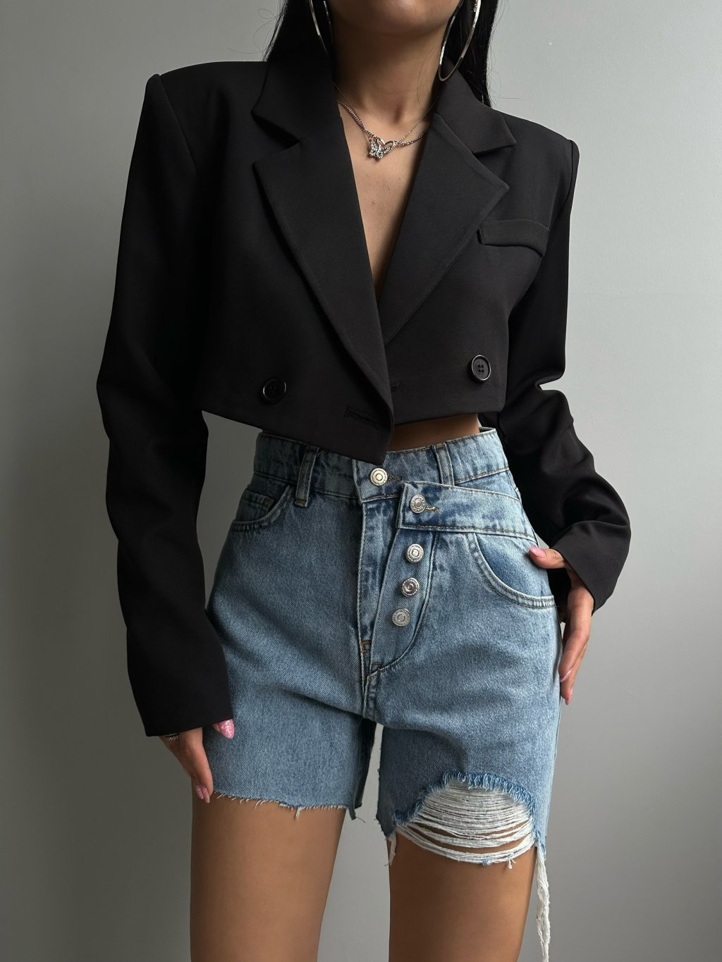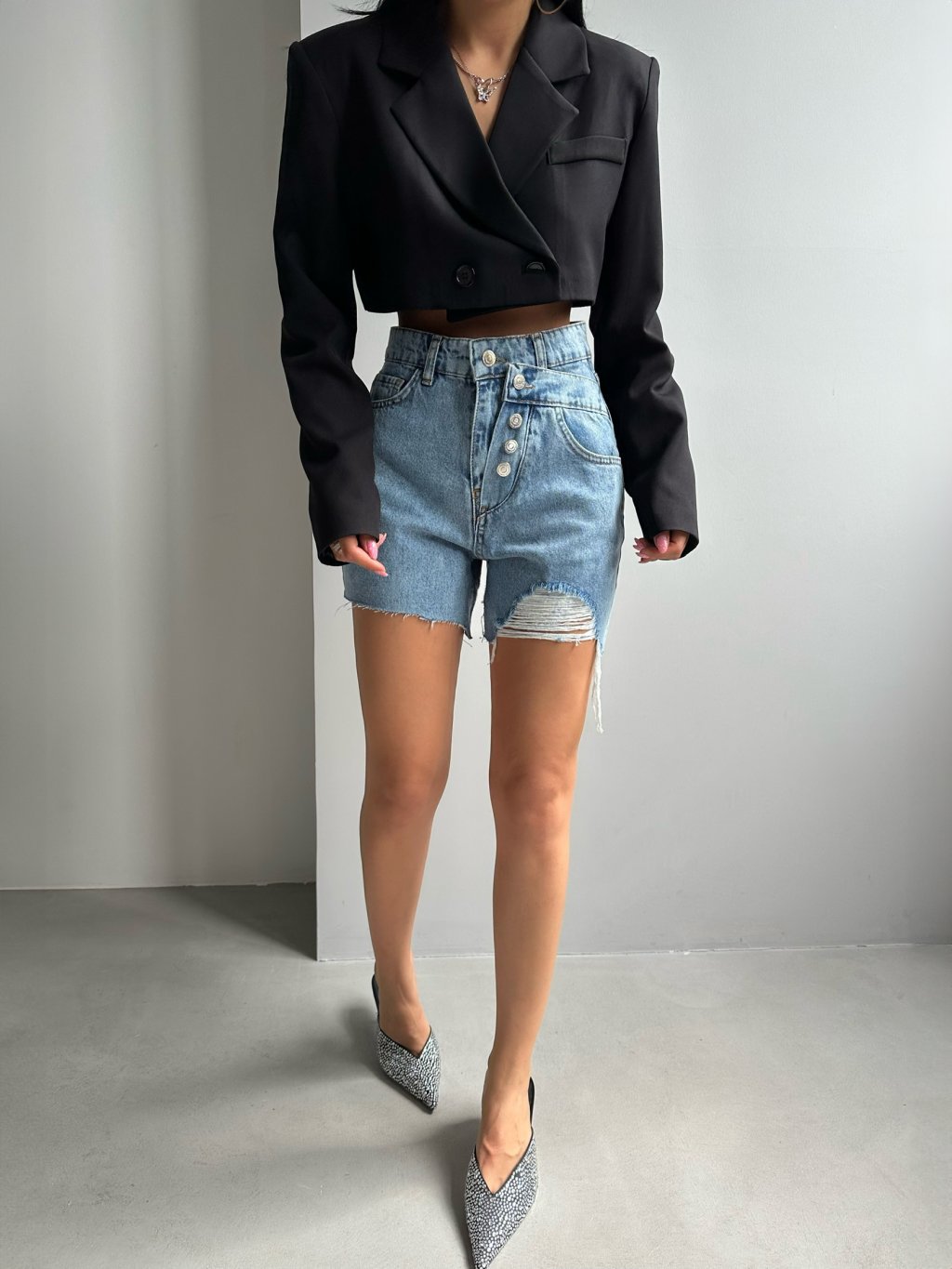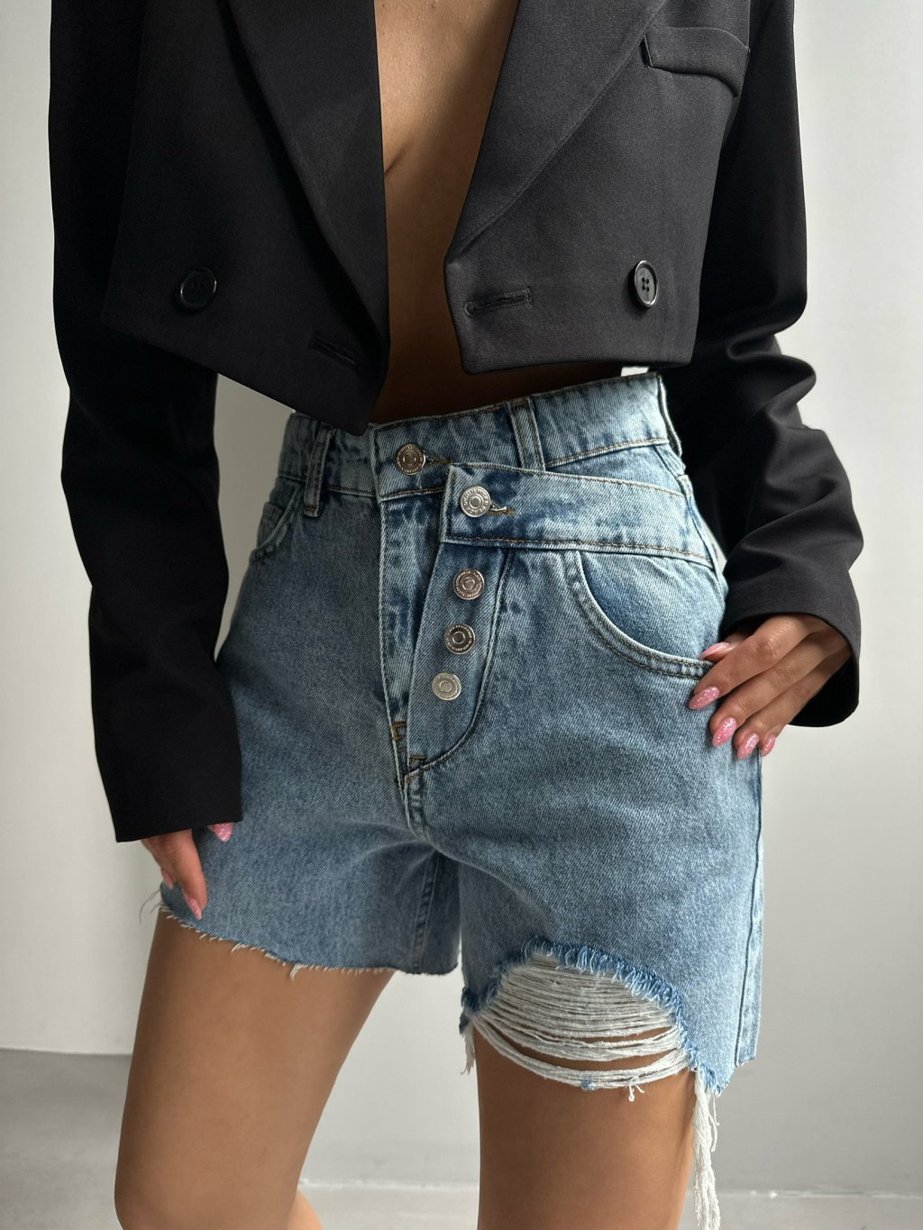 Majú moderný asymetrický zapínací detail na gombíky, ktorý dodáva originálny vzhľad. Štýlové roztrhané prevedenie na jednej strane dodáva šortkám ležérny a rebelsky elegantný nádych. Vďaka kvalitnému rifľovému materiálu sú pohodlné a skvele sa kombinujú s rôznymi topmi – od jednoduchých tričiek až po elegantné blúzky. Skombinujte ich s teniskami pre casual look alebo s podpätkami pre odvážnejší outfit.