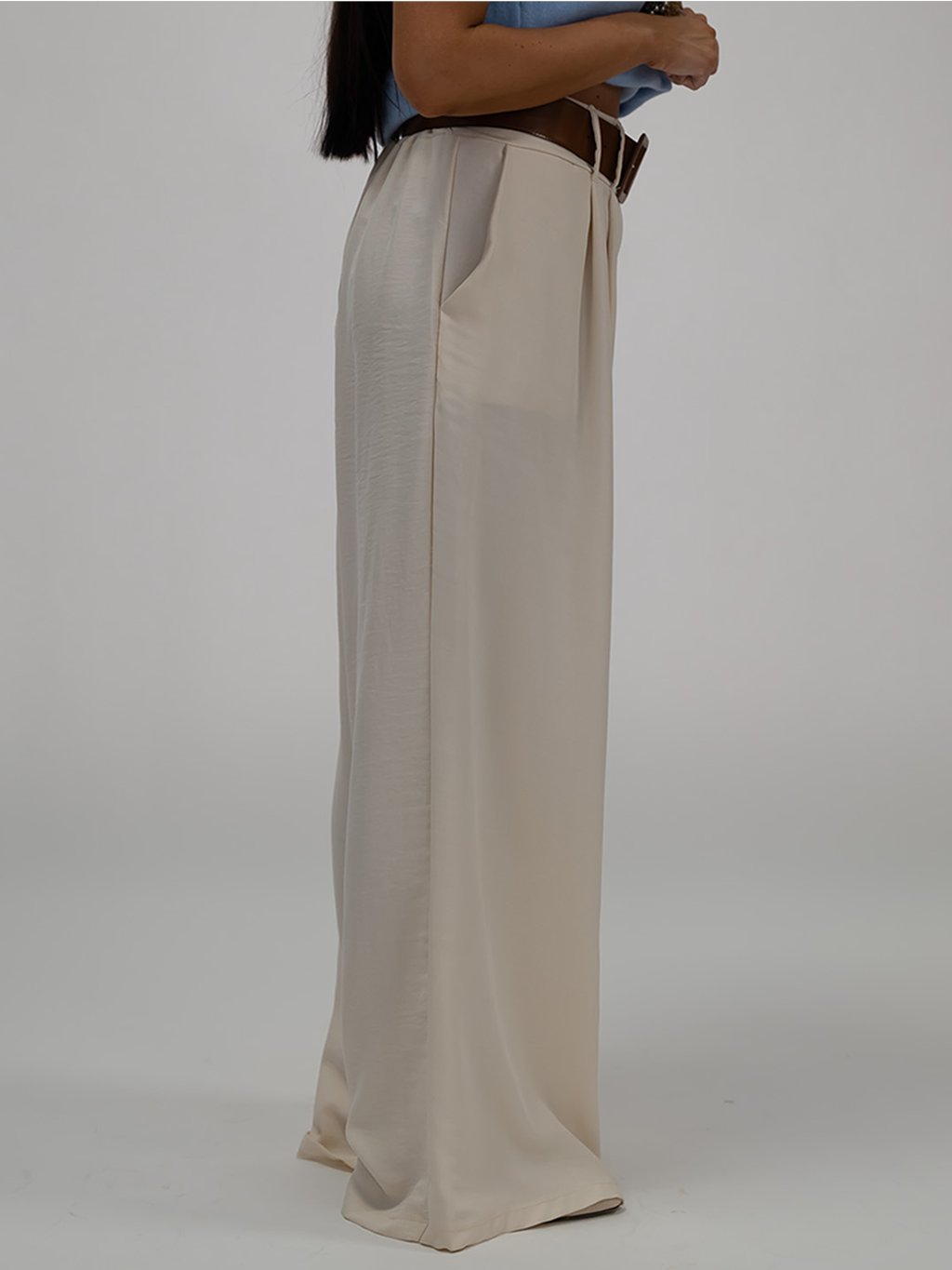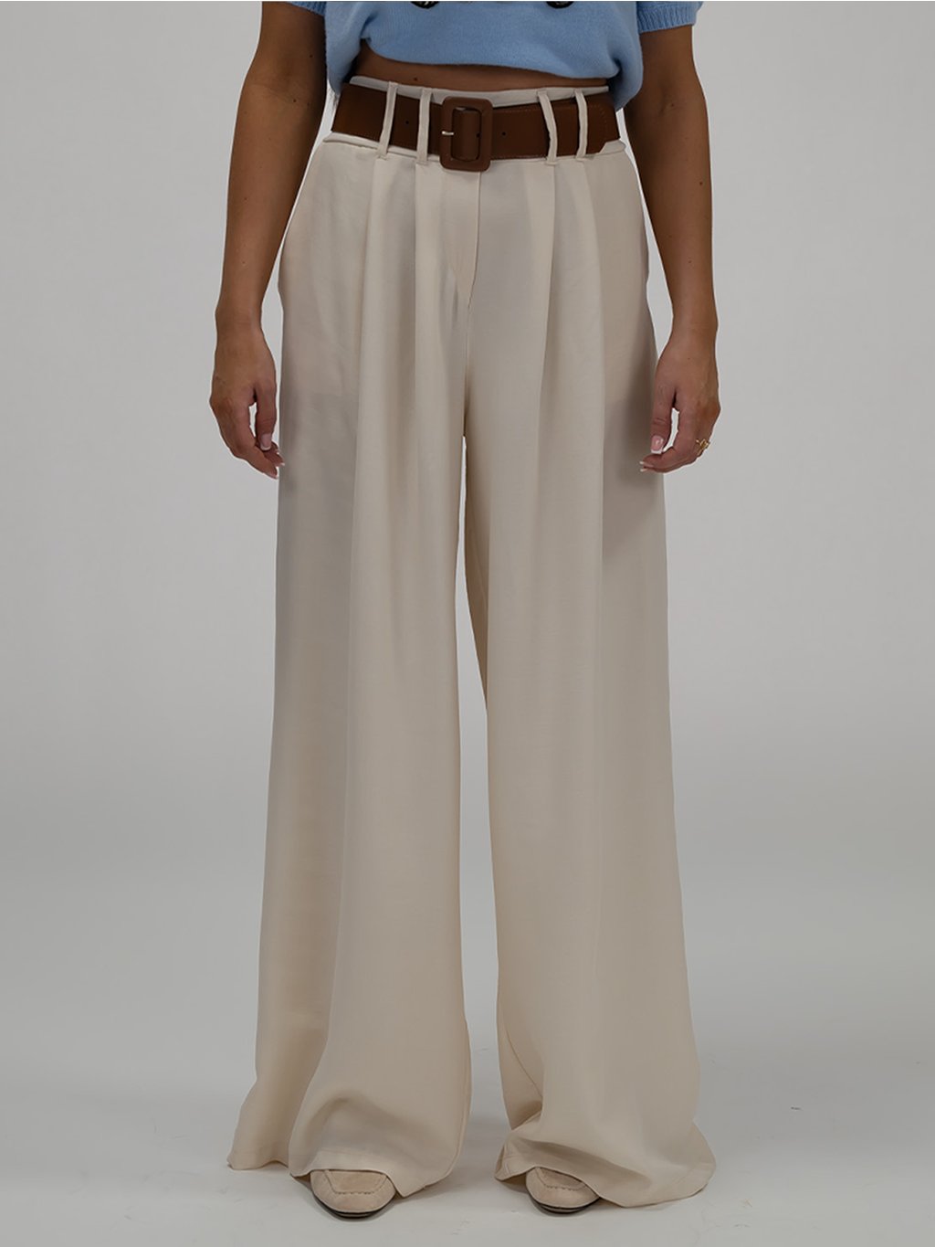 Vyrobené z ľahkého materiálu, ideálne splývajú s postavou a vytvárajú sofistikovaný vzhľad. Vysoký pás zdôrazňuje siluetu a široký opasok v hnedej farbe pridáva štýlový akcent. Perfektné na formálne aj neformálne príležitosti, tieto nohavice môžete ľahko kombinovať s blúzkou alebo jednoduchým topom pre moderný a vkusný outfit.