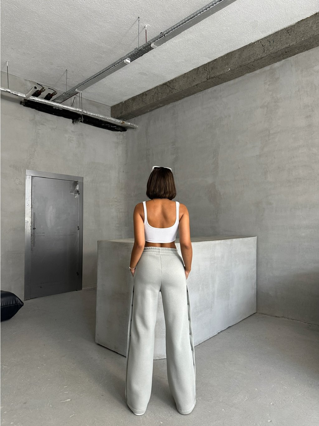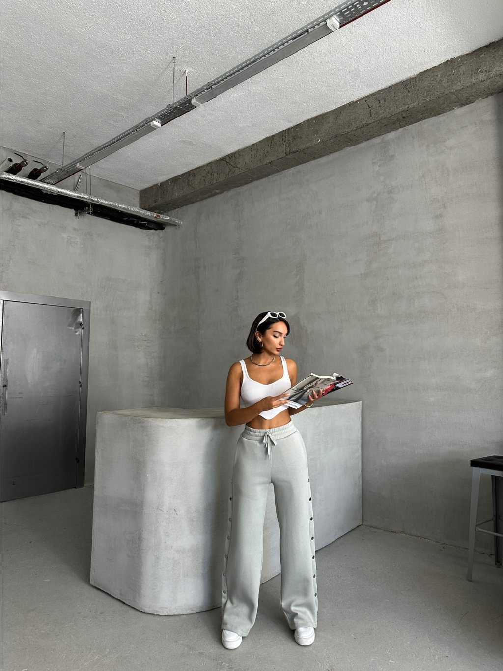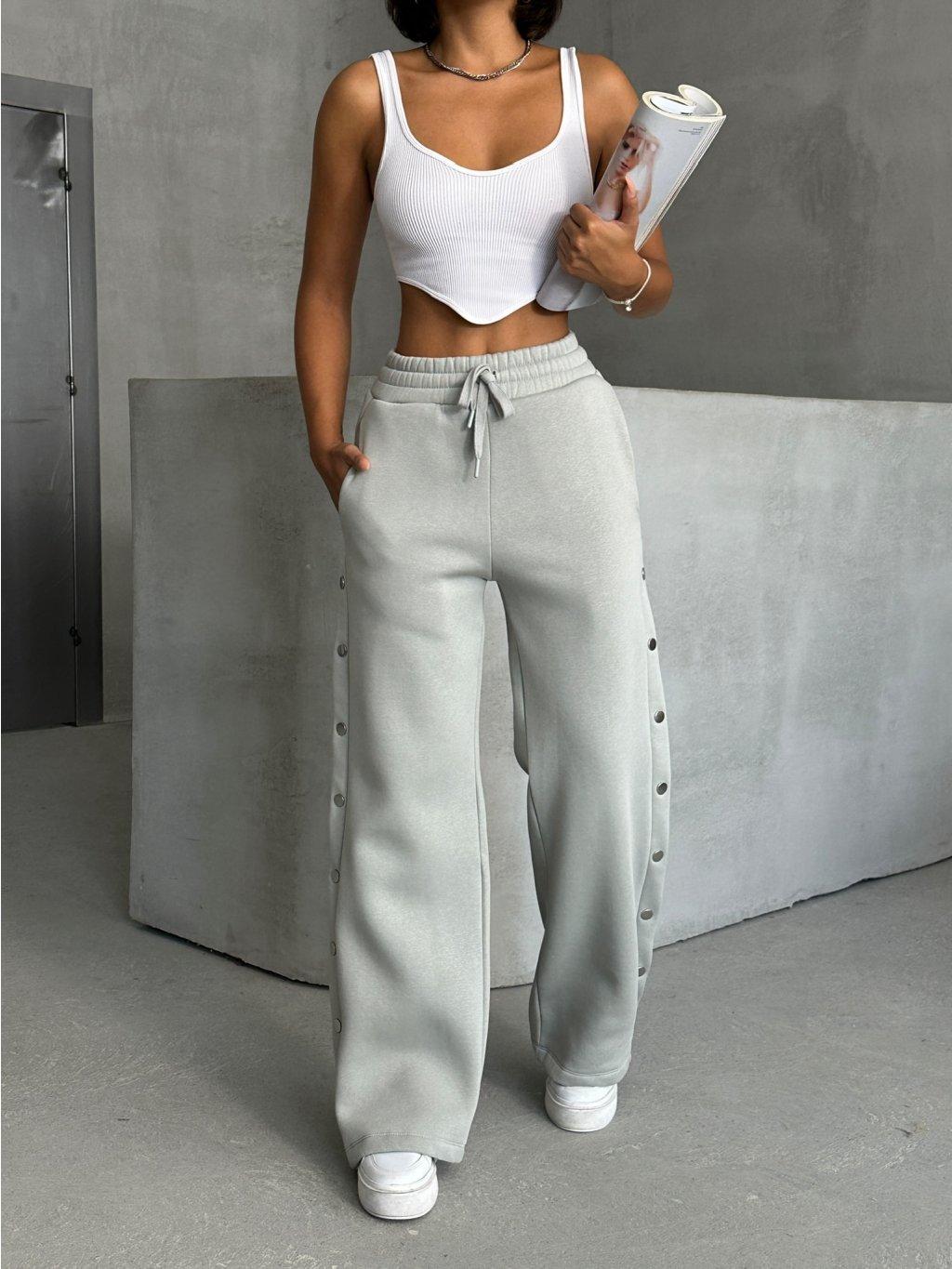 Voľný strih a elastický pás zabezpečujú maximálne pohodlie, zatiaľ čo dekoratívne cvoky na bokoch dodávajú moderný a trendový vzhľad. Tepláky sú vybavené praktickými vreckami, ktoré zvyšujú ich funkčnosť. Ideálne na voľnočasové nosenie alebo na vytvorenie ležérneho outfitu s módnym nádychom.