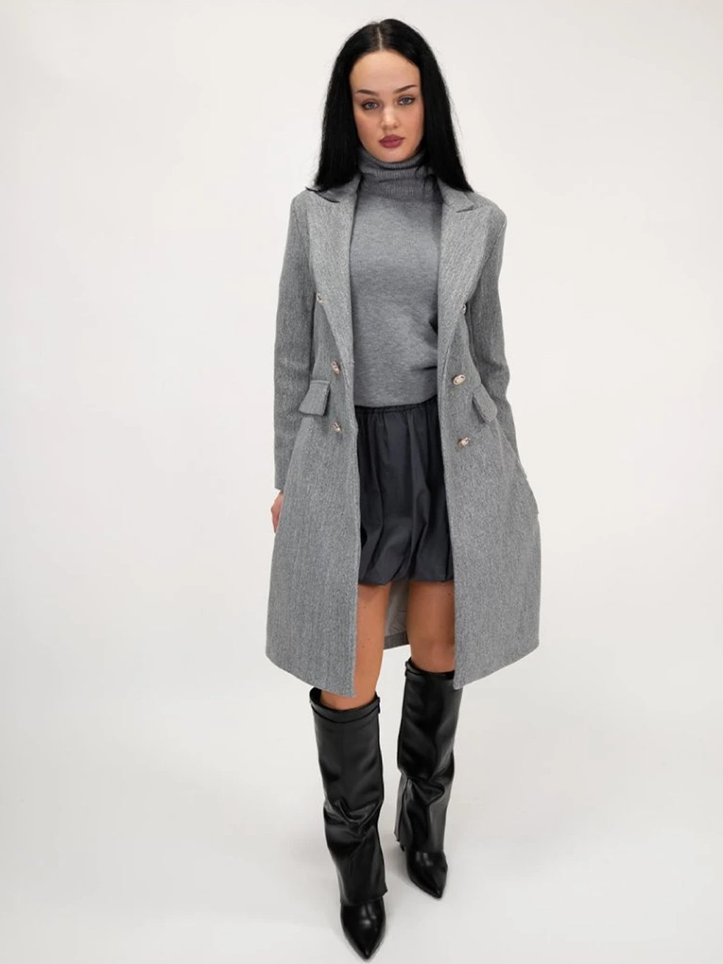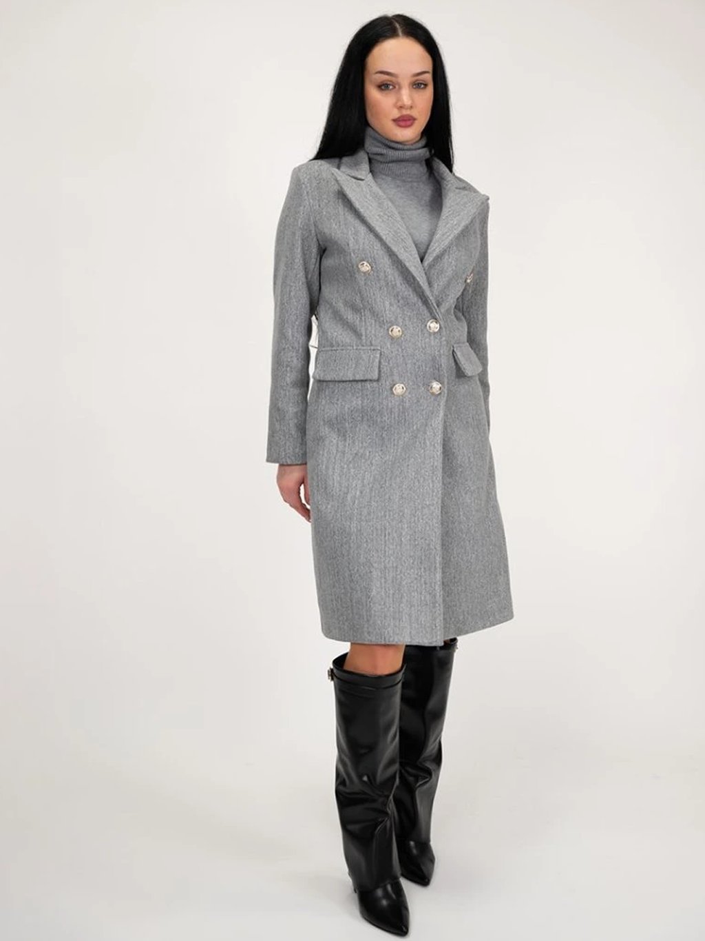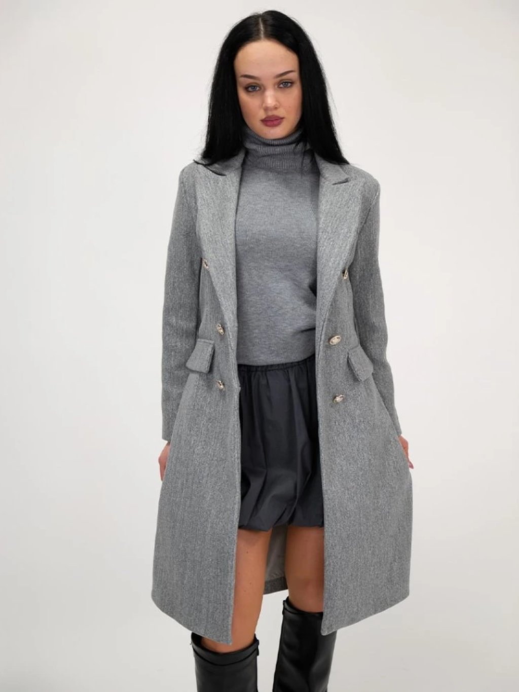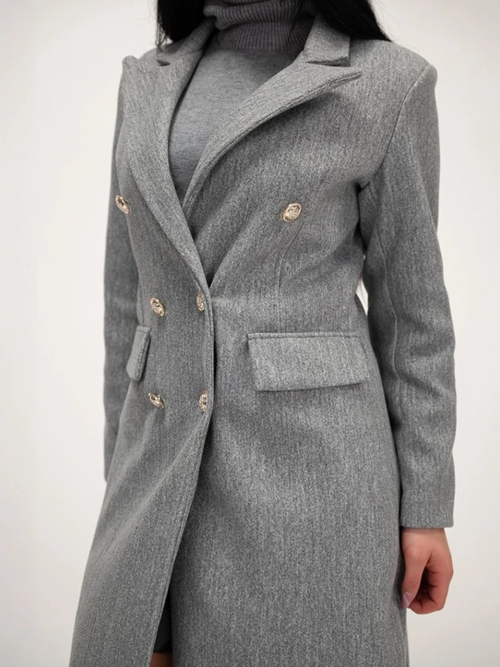 Kabát má dvojradové zapínanie na zlaté gombíky, ktoré mu dodáva luxusný a moderný vzhľad. Jeho áčkový strih lichotí postave a poskytuje pohodlie pri nosení, pričom predné vrecká sú len imitáciou, vďaka čomu si kabát zachováva čisté línie a minimalistický dizajn. Precízne spracovanie a kvalitný materiál zaručujú elegantný vzhľad aj praktickosť počas chladnejších dní.