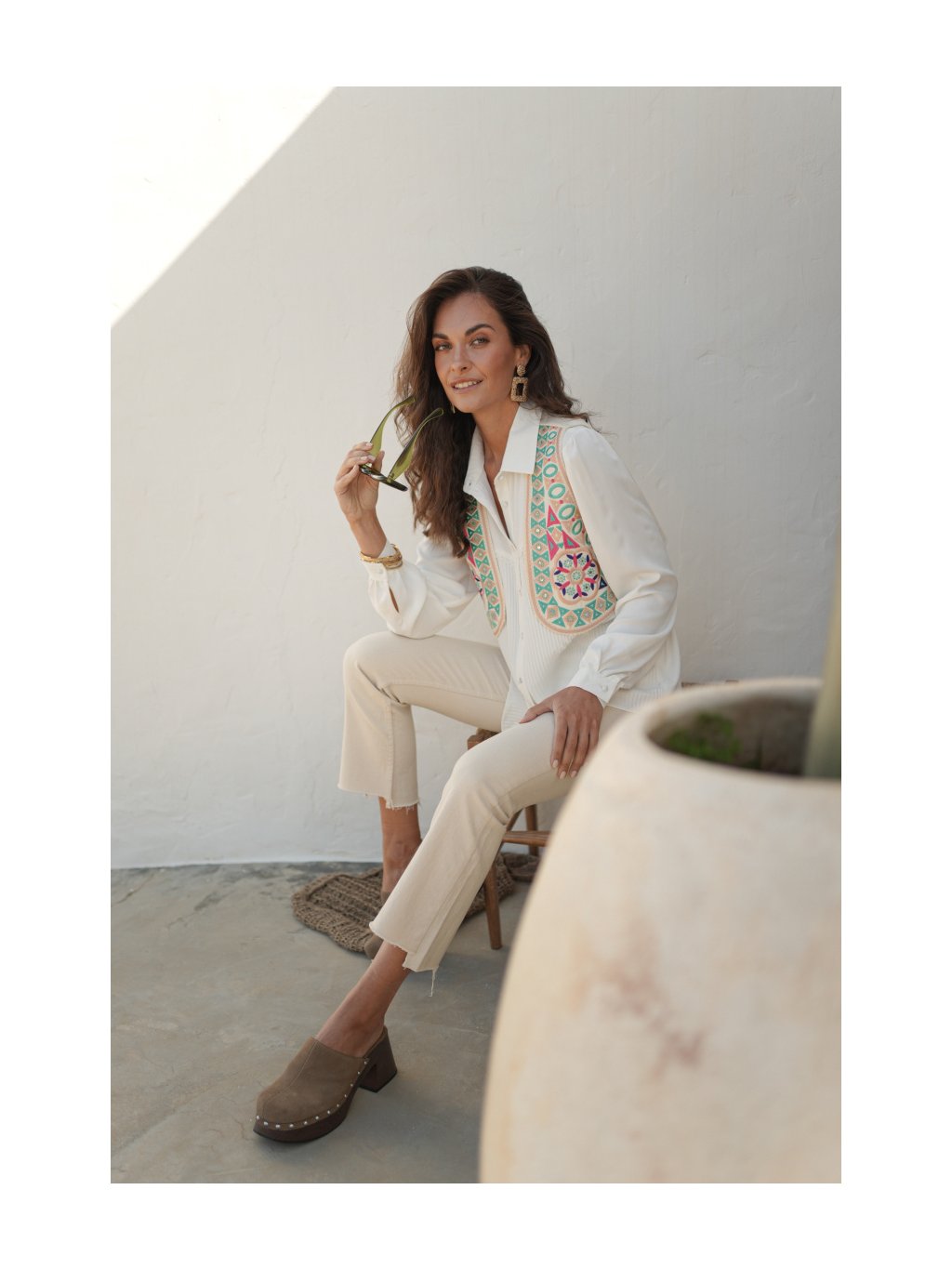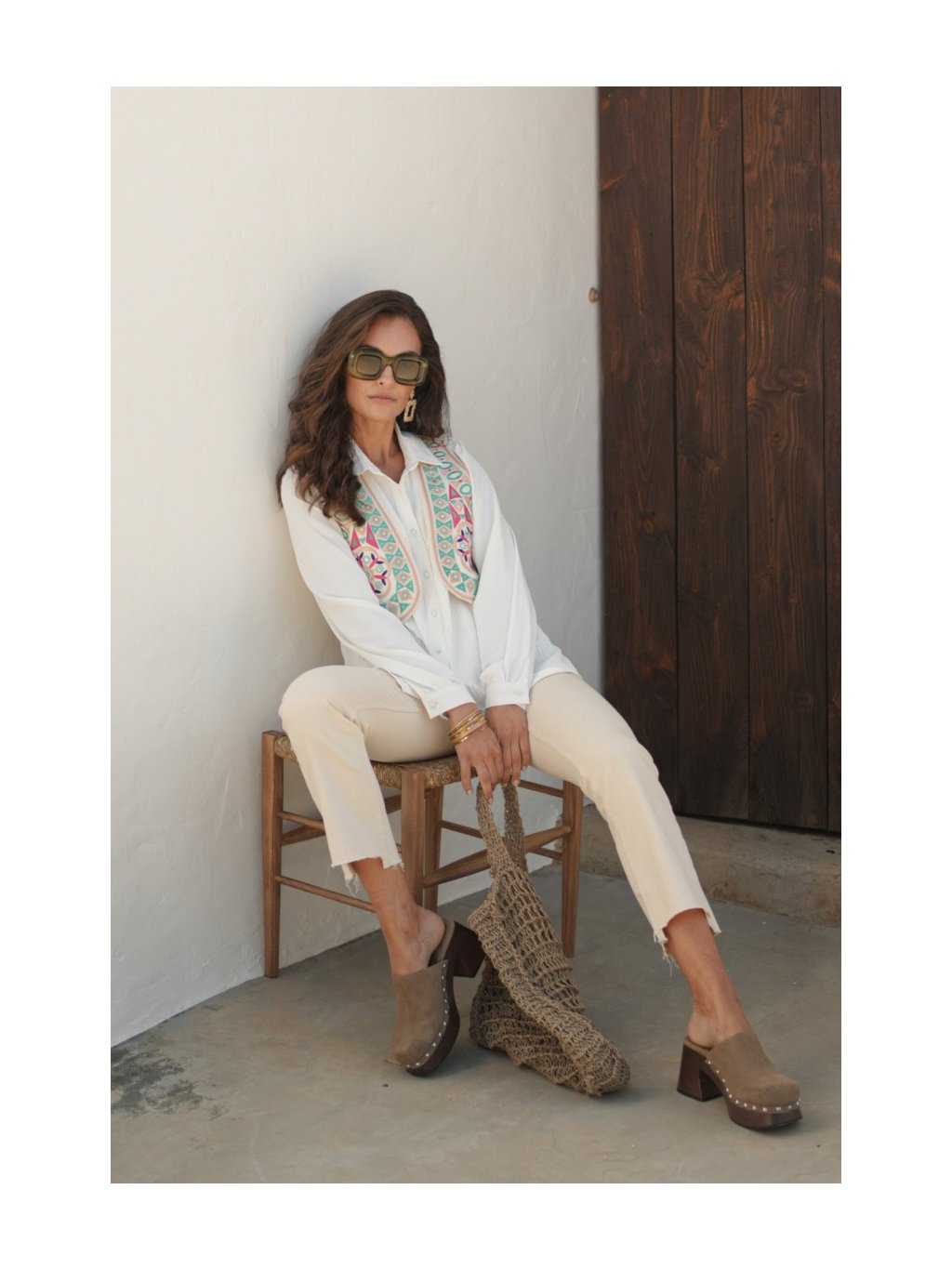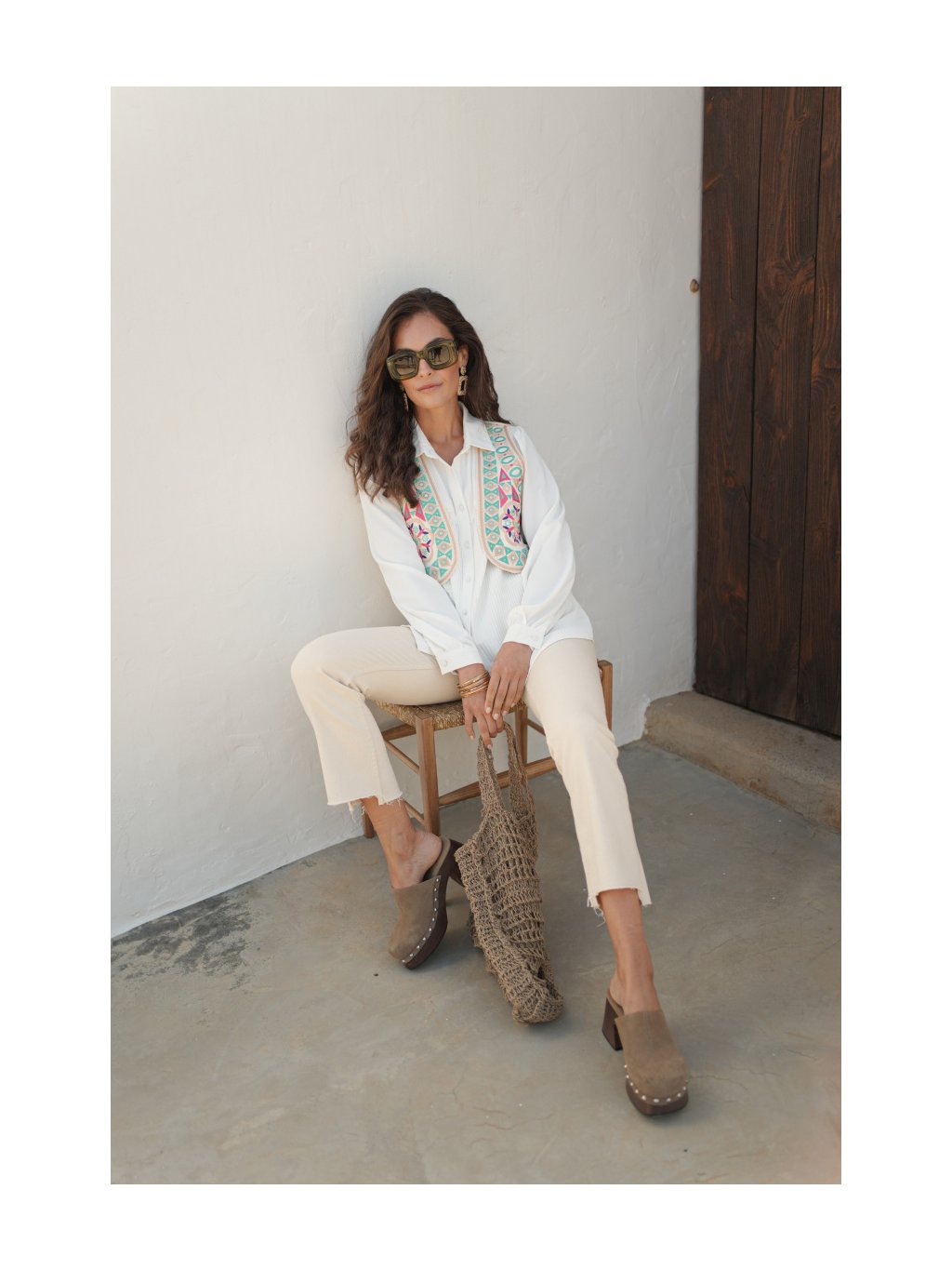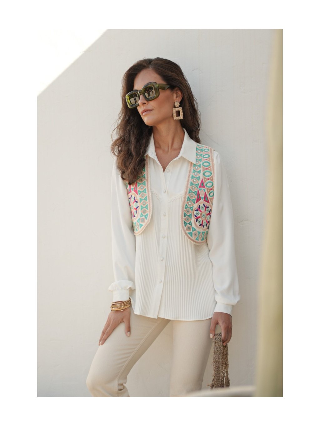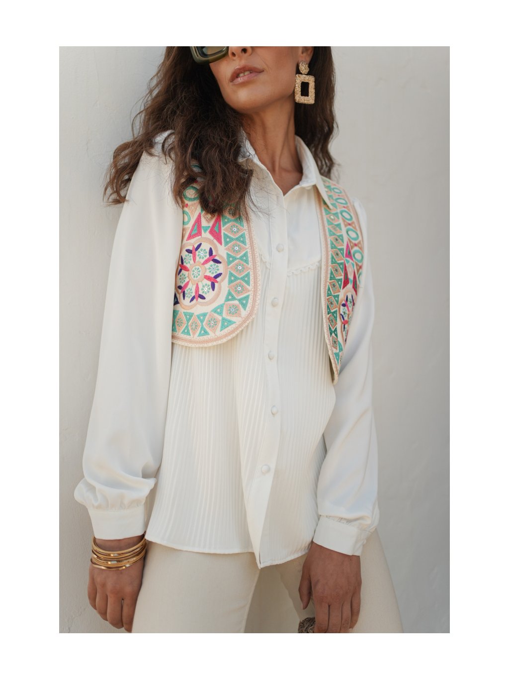 Je vyrobená z kvalitného materiálu a zdobená precíznou výšivkou s geometrickými a kvetinovými motívmi v pestrých farbách. Kontrastné detaily na lemoch jej dodávajú elegantný a bohémsky nádych. Perfektne sa hodí k jednoduchým jednofarebným kúskom, ako sú nohavice s vysokým pásom alebo priliehavé tričko, a je skvelou voľbou na oživenie outfitu. Táto vesta je ideálnym doplnkom pre ženy, ktoré milujú štýlové a netradičné kúsky.