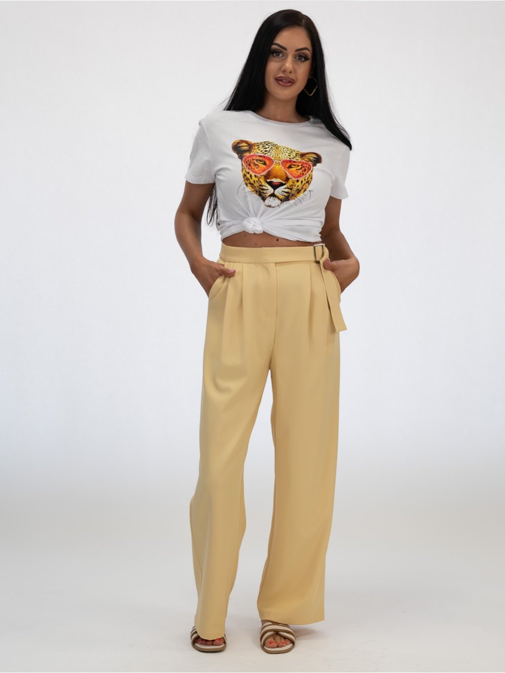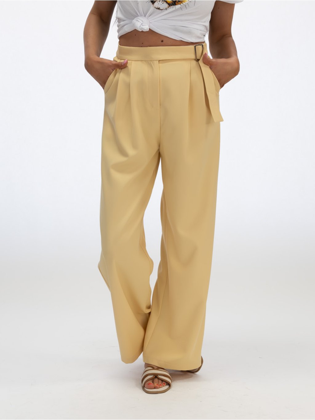 Široké nohavice s jemným plisovaním v prednej časti krásne splývajú a dodávajú outfitu vzdušnosť a ľahkosť. Sú vyrobené z kvalitného, mierne elastického materiálu, ktorý zabezpečuje pohodlné nosenie počas celého dňa.Pás je zvýraznený elegantným detailom – opaskom so štýlovou kovovou prackou, ktorý umožňuje jemné prispôsobenie obvodu. Vďaka svojej nadčasovej žltej farbe sú tieto nohavice skvelou voľbou na každodenné nosenie, ale aj na špeciálne príležitosti. Môžete ich kombinovať s jednoduchým tričkom a teniskami pre ležérny look alebo s blúzkou a lodičkami pre elegantný outfit.