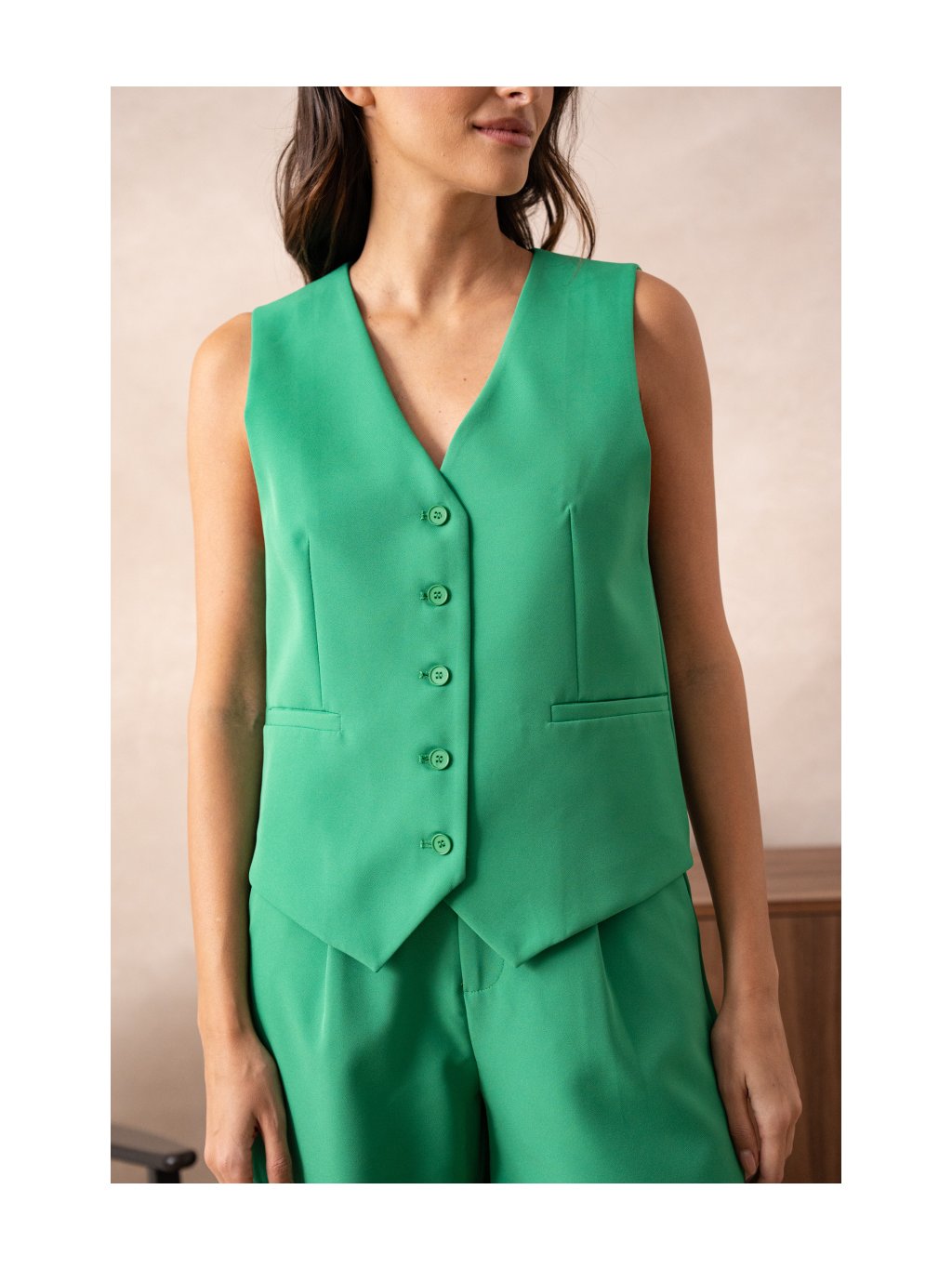 Má vypasovaný strih, ktorý krásne zvýrazní siluetu, a hlboký výstrih do V, ktorý pridáva na ženskosti. Jemné zapínanie na gombíky a decentné falošné vrecká dodávajú tomuto kúsku štýlový a upravený vzhľad. Vestička sa dá ľahko kombinovať s džínsami pre ležérny look alebo s elegantnými nohavicami či sukňou pre formálnejší outfit. Ideálna voľba na všestranné nosenie, či už do práce, na stretnutie s priateľmi alebo špeciálnu príležitosť.
