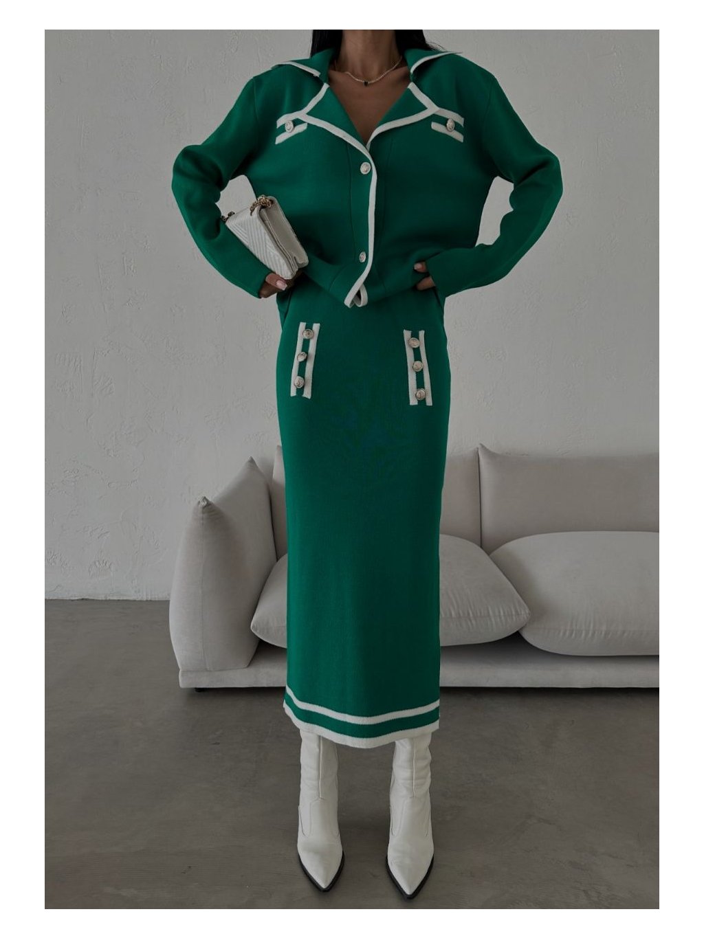 Kardigan je zdobený kontrastnými bielymi detailmi a ozdobnými gombíkmi, pričom jeho voľnejší strih zabezpečuje pohodlie a eleganciu. Sukňa má elastický pás, čo poskytuje maximálne pohodlie, a je tiež ozdobená bielymi detailmi, ktoré dotvárajú celý outfit. Tento komplet je ideálny na každodenné nosenie aj na výnimočné príležitosti, keď chcete pôsobiť štýlovo a sofistikovane.